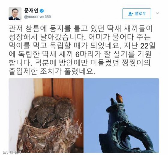 문 대통령은 지난 14일 "찡찡이가 (청와대에) 입주했는데 걱정이 생겼다"며 "관저 구석 유리창문과 미닫이 한지창문 사이의 좁은 틈에 딱새가 새끼를 키우고 있는데, 제가 당선된 날 부화했다고 한다"고 적었다.