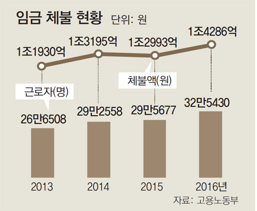 근로자 처우 개선을 위해 최저임금이 큰 폭으로 인상됐지만 그나마 정해진 임금도 받지 못해 고통을 겪는 근로자가 늘고 있다. 18일 고용노동부에 따르면 임금체불 신고는 2013년 18만1182건에서 지난해 21만7530건으로 늘었다. 체불 총액도 같은 기간 1조1930억 원에서 1조4286억 원으로 2000억 원 이상 증가했다.