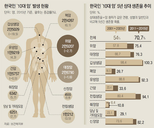 한국인 암 발생률이 4년 연속 줄었다. 암 환자 생존율은 2년 연속 70%가 넘었다. 보건복지부와 국립암센터는 21일 이런 내용의 ‘2015년 암 등록 통계’를 발표했다.
