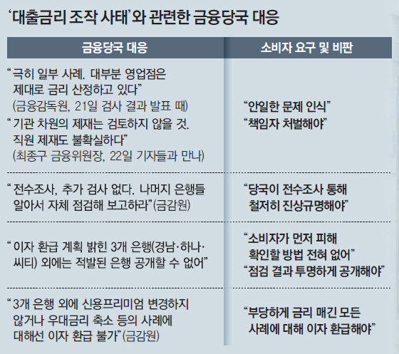금융당국의 안일한 인식에 대한 비판도 쏟아지고 있다. 오승원 금감원 부원장보는 21일 9개 은행의 검사 결과를 발표하면서 “적발 사례는 극히 일부다. 대부분 영업점은 모범적으로 금리를 산정하고 있다”고 설명했다. 다음 날인 22일 최종구 금융위원장은 “은행 개별창구에서 일어난 일이다. 기관 차원의 징계까지 가진 않을 것”이라며 선을 긋기도 했다. 이를 두고 일각에서는 “금융당국이 사태를 축소하기에 급급하다”는 지적까지 제기된다.