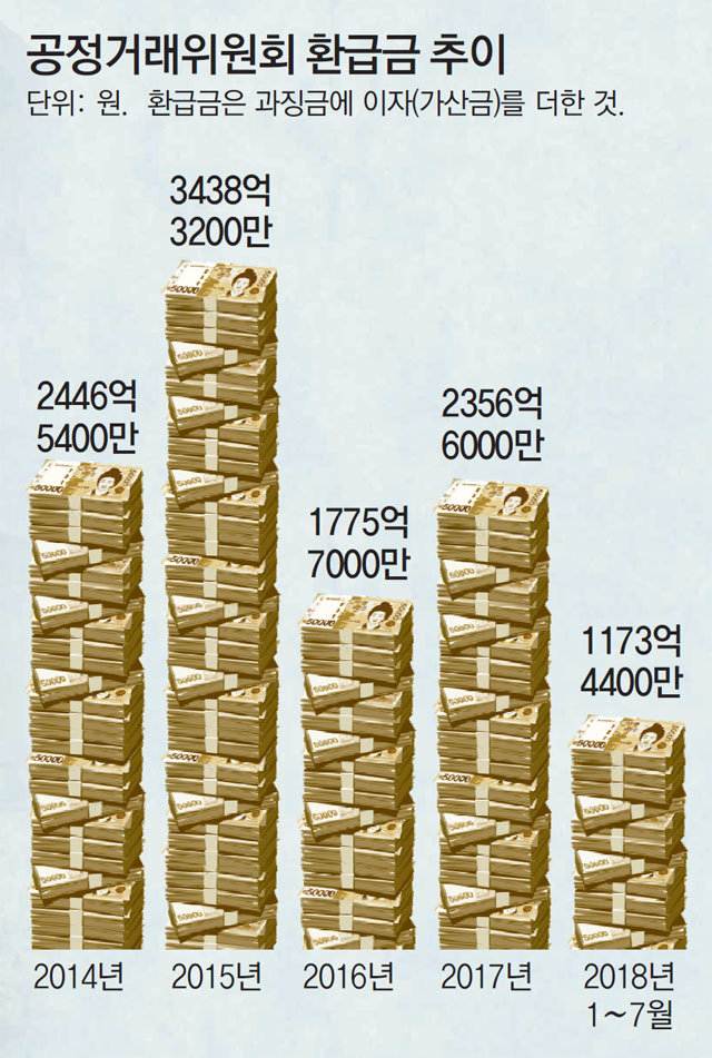 공정위가 이자를 포함해 돌려준 과징금 환급금은 2014년 2446억 원에서 2015년 3438억 원으로 급증한 뒤 2016년 1775억 원으로 감소했다가 2017년 2356억 원으로 다시 늘었다. 올해는 7월까지 환급액만 1173억 원에 이른다.