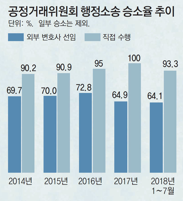 문제는 외부 변호사 선임 소송이 직접 소송보다 승소율이 낮다는 점이다. 외부 변호사를 선임한 소송에서 공정위가 100% 이긴 ‘전부 승소’ 비율은 64.1%에 그쳤다.
