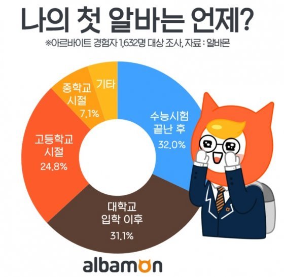 아르바이트를 처음 시작하는 시기는 ‘수능 시험 끝난 직후’가 가장 많은 것으로 조사됐다.