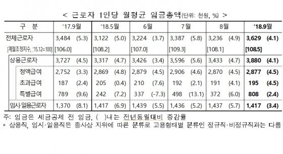 이중에서 상용직은 388만원으로 작년 같은 기간(372만7000원) 대비 4.1% 늘었고, 임시·일용직은 141만7000원으로 작년 같은 기간(137만원) 대비 3.4% 늘어나는 데 그쳤다.