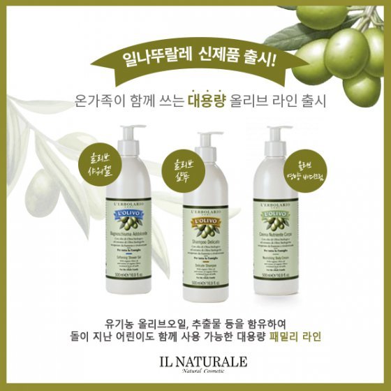'올리브 샴푸' 는 온 가족의 윤기 있는 모발에 도움을 주는 제품이다. 유기농 올리브 오일과 올리브 추출물 그리고 올리브 잎 증류수 등이 주요 성분이다. 이 성분들은 모발을 깨끗하게 세정해주며 보습과 영양이 풍부한 모발을 가꾸는데 도움을 준다.