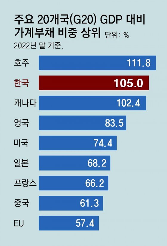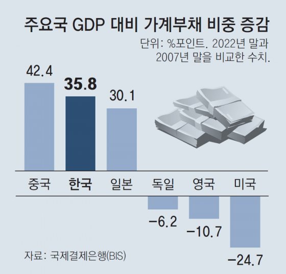14일 동아일보가 국제결제은행(BIS) 통계를 분석한 결과 지난해 말 기준 한국의 국내총생산(GDP) 대비 가계부채는 105.0%로 2007년보다 35.8%포인트 올랐다. BIS가 제시한 가계부채 비율 임계치 80%를 훌쩍 넘어선다. 이 기간 상승 폭도 주요 20개국(G20) 중 최근 부동산 위기가 벌어진 중국(42.4%포인트)에 이어 두 번째다.