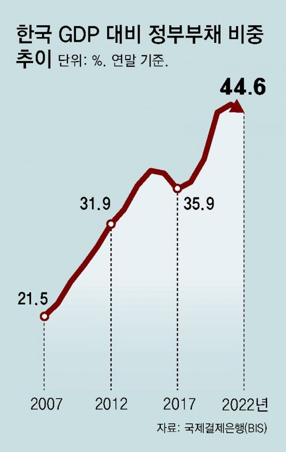나랏빚도 금융위기 이후 급증했다. BIS에 따르면 2007년 말 21.5%였던 한국의 GDP 대비 정부 부채 비율은 지난해 말 44.6%로 치솟았다. 코로나19 기간 정부의 막대한 재정지출로 국가채무가 걷잡을 수 없이 불어났지만 국회는 주요국들이 모두 갖고 있는 재정준칙의 도입을 미루고 있다. 기획재정부에 따르면 7월 말 기준 국가채무는 한 달 전보다 14조5000억 원 늘어 1097조8000억 원에 달했다.
