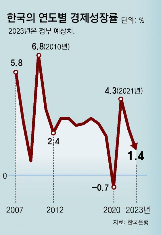 성장 엔진도 차갑게 식어가고 있다. 정부가 전망한 올해 경제성장률은 1.4%지만 더 낮아질 가능성도 있다. 올해 한국의 성장률이 25년 만에 일본보다 낮아질 것이란 전망까지 나왔다. 이미 한국의 성장률은 2021년 이후 2년 연속 경제협력개발기구(OECD) 회원국 평균을 밑돌고 있다. 석병훈 이화여대 경제학과 교수는 “한국은 산업 구조 면에서 보면 기존 한계 기업들의 퇴출은 감소하고, 시장은 포화상태라 신규 혁신 기업의 진입도 이뤄지지 않고 있다”면서 “악화된 각종 거시경제 지표 등을 함께 고려하면 다음 글로벌 경제위기 때는 대응이 더 어려울 수밖에 없다”고 말했다.