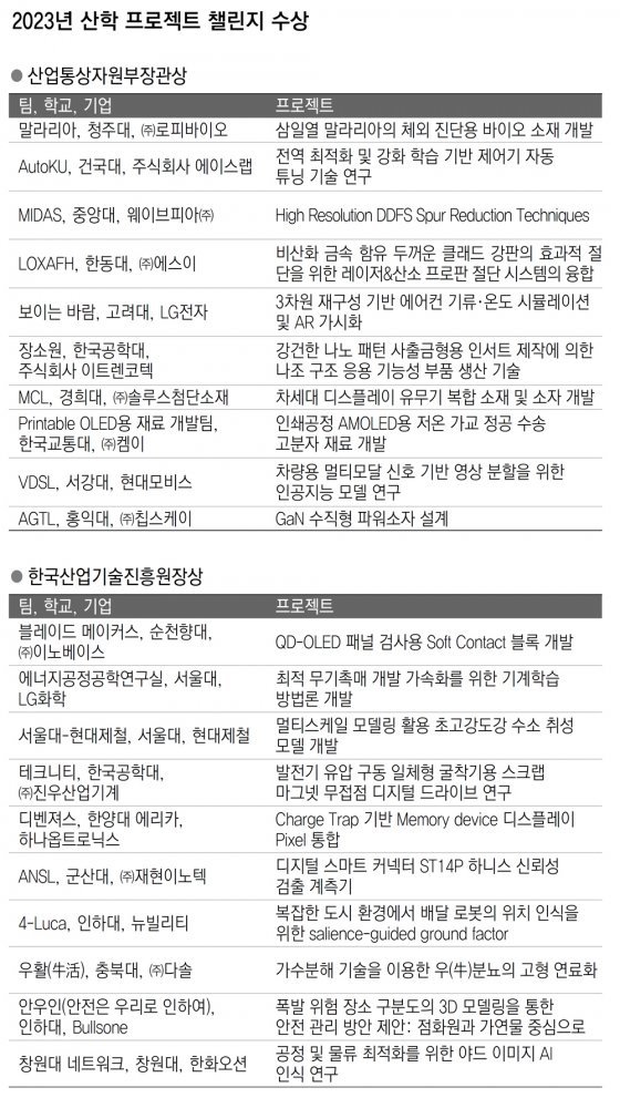 ‘2023 산학 프로젝트 챌린지’ 시상식에 참석한 주요 인사와 모든 참가팀들이 기념촬영을 하고 있다. 산업통상자원부 제공대한민국 산업 발전의 핵심 역량인 청년 공학도와 산업 현장 간의 협업 성과를 겨루는 축제의 장이 열렸다. 21일 서울 마포구 상암 아프리카 콜로세움에서는 ‘2023 산학 프로젝트 챌린지’가 진행됐다. 올해 4회째를 맞은 이번 행사는 산업통상자원부와 한국산업기술진흥원(KIAT)의 ‘산업혁신인재성장지원사업’ 지원을 받는 석·박사 학생이 산업현장에서 나타나는 기술적 문제를 기업과의 산학 프로젝트를 통해 해결한 혁신 성과를 선보이는 자리다.