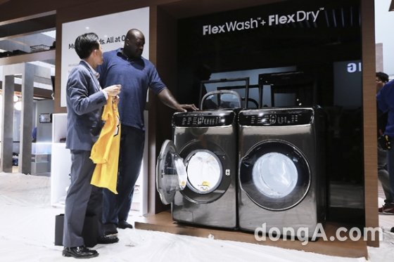 샤킬 오닐이 5일(현지시간) 미국 라스베이거스에서 개막한 \'CES 2017\'에서 삼성전자 전시관을 방문해 ‘플렉스워시’ 세탁기와 ‘플렉스드라이’ 건조기를 보고 있다. ‘플렉스워시’와 ‘플렉스드라이’는 2개의 독립 공간을 일체형으로 설계, 소비자의 다양한 요구를 맞춤형으로 해결해 주는 신개념 세탁 시스템이다.사진제공=삼성전자