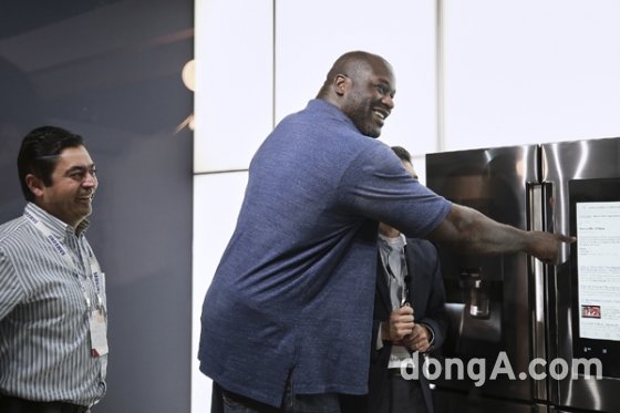 샤킬 오닐이 5일(현지시간) 미국 라스베이거스에서 개막한 'CES 2017'에서 삼성전자 전시관을 방문해 삼성 ‘패밀리허브 2.0’의 터치스크린을 만져보고 있다. ‘패밀리허브 2.0’ 냉장고는 기존 보다 음성인식 기능 강화로 더 똑똑해졌고, ‘푸드 매니지먼트’, ‘패밀리 커뮤니케이션’, ‘엔터테인먼트’ 기능이 더욱 강화됐다. 사진제공=삼성전자