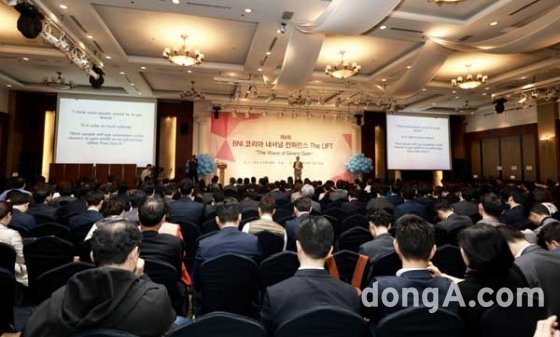 ▲ 제 4회 BNI 내셔널 컨퍼런스 The LIFT6일 프리마호텔 그랜드볼룸에 ‘기버스 게인(Givers Gain, 주는 자가 얻는다)’의 힘찬 물결을 담은 대형 현수막이 펼쳐졌다. 국내 최대규모의 협업 컨퍼런스로 업계의 주목을 받았던 제 4회 BNI 내셔널 컨퍼런스 The LIFT가 바로 그 현장.