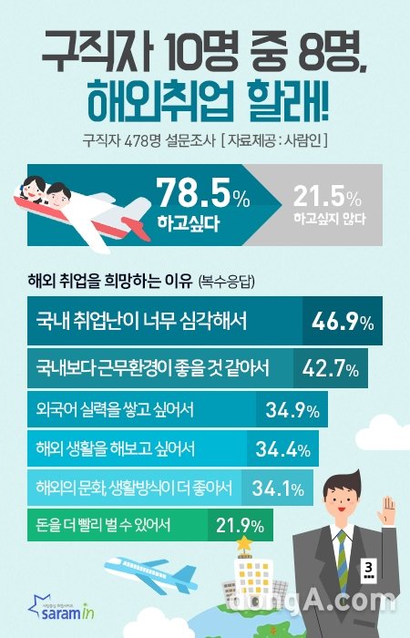 그래픽=사람인 제공구직자 10명 중 8명은 해외취업 의향이 있는 것으로 나타났다. 구인구직 매칭플랫폼 사람인이 구직자 478명을 대상으로 ‘해외취업 의향’을 주제로 설문한 결과, 78.5%가 이같이 답했다.