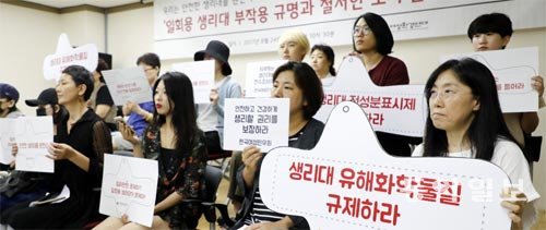 “생리대 부작용 원인 밝혀주세요” 24일 서울 중구 환경재단에서 여성환경연대가 일회용 생리대의 부작용 원인 규명과 안전성 조사를 촉구하는 기자회견을 열고 있다. 원대연 기자 yeon72@donga.com부작용 논란에 휩싸인 ‘릴리안 생리대’의 판매와 유통이 모두 중단됐다. 정부는 즉각 5개 주요 생리대 제조업체에 대한 현장조사에 들어갔고, 생리대 전수조사도 검토하겠다고 밝혔다. 일부 소비자는 자궁근종 같은 심각한 생식기 질환을 호소하며 집단소송에 나설 움직임을 보이고 있어 ‘제2의 가습기 살균제’ 사태로 번질 수도 있다는 관측이 나온다.