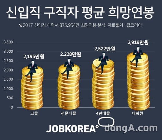 그래픽=잡코리아 제공잡코리아 조사…대학원졸 2,919만원 > 4년대졸 2,522만원 > 전문대졸 2,228만원 > 고졸 2,195만원
