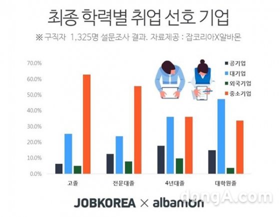 최종학력별로도 취업 선호 기업의 차이가 컸다. 고졸 구직자들의 경우는 중소기업 취업선호가 63.0%로 가장 높았으며, 전문대졸 구직자도 55.5%로 높았다. 4년대졸 구직자들은 중소기업, 대기업이 각각 36.2%, 36.1%로 비슷했으며, 대학원졸 구직자들은 대기업 취업을 선호하는 경향이 47.5%로 가장 높았다.