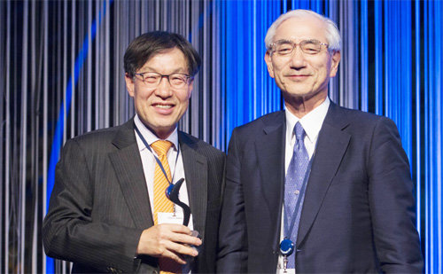 17일(현지 시간) 벨기에 브뤼셀에서 열린 세계철강협회 이사회에서 부회장에 선임된 권오준 포스코 회장(왼쪽)과 회장에 선임된 고세이 신도 신일철주금사장. 포스코 제공권 회장은 포스코 기술부문 사장 시절인 2012년부터 세계철강협회 기술분과위원장으로 활동했다.