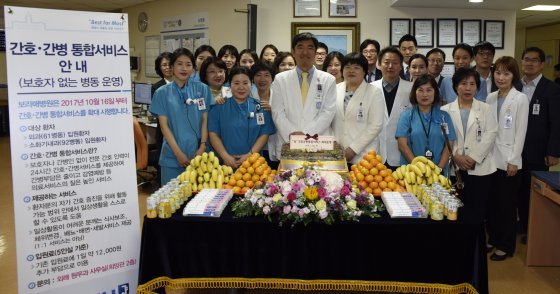 간호·간병 통합서비스 병동 개소식간호·간병 통합서비스는 보호자나 간병인 없이 전문 간호 인력이 24시간 환자에게 통합 의료서비스를 제공하는 것이다. 지난 2013년 7월 국내 처음 도입돼 현재 374개 병원, 2만4000병상에서 운영되고 있다. 하루 약 8만 원의 개인 간병비 부담을 약 1만6000원(5인실 기준)의 수가로 해결할 수 있어 환자나 보호자에게 경제적으로 큰 도움이 된다.