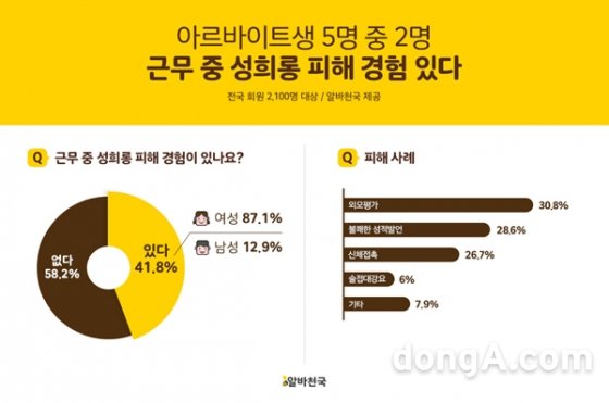 아르바이트 전문 포털 알바천국이 지난 11월 20일부터 30일까지 전국 아르바이트생 2,100명을 대상으로 ‘아르바이트생 대상 성희롱 실태조사’를 실시한 결과, 응답자의 41.8%가 근무 중 성희롱 피해를 경험했으며, 특히 여성 응답자 비율이 87.1%에 달한 것으로 나타났다. 사진=동아일보 DB아르바이트생 5명 중 2명은 근무 중 성희롱 피해를 경험한 것으로 드러났다. 하지만 성희롱 피해 경험자의 대다수는 문제 해결을 시도하기보다 참고 넘어가거나 대응 없이 그만두는 방법을 택한 것으로 조사됐다.