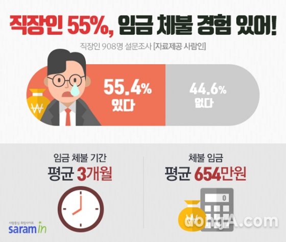 구인구직 매칭플랫폼 사람인이 직장인 908명을 대상으로 ‘임금 체불 경험’을 주제로 조사한 결과, 55.4%가 체불 경험이 있다고 답했다. 이들 중 17.7%는 현재도 월급이 밀려있는 것으로 나타났다.