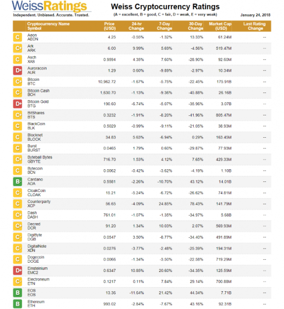 사진=와이스 레스팅스미국 신용평가사 와이스 레이팅스(Weiss Ratings)가 가상화폐 등급을 발표했다.