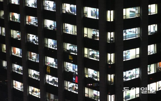 많은 사람들이 사무실 불을 밝히며 밤늦게까지 일하지만 삶은 갈수록 팍팍해진다. 왜일까. ‘호모 이코노미쿠스’ 저자는 “더 많은 소비와 축적을 위해 관습적으로 일하는 사회가 만들어지고 있기 때문”이라고 분석한다. 동아일보 DB‘만리장스펙’(만리장성만큼 긴 스펙)을 쌓기 위해 청춘을 바치는 취업준비생, 대출과 부채에 허덕이는 중산층, 경제협력개발기구(OECD) 회원국 중 두 번째로 가장 오래 일하는 과로사회….