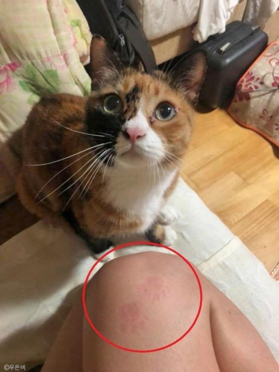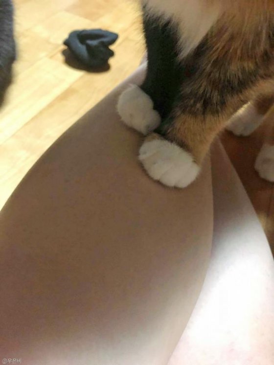 지난 11일 일곱 마리 고양이의 집사 은비 씨는 한 인터넷 동물 커뮤니티에 "츄르 드시는 내내 제 허벅지에 발 올려놓고 계시더니 발자국이 찍혔어요"라는 글과 함께 몇 장의 사진을 공개했다.