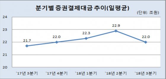 작년 3분기 21조67570억원을 기록한 이후 매 분기 상승세를 보이던 증권 결제대금은 이번 분기 처음으로 하락세로 전환했다.