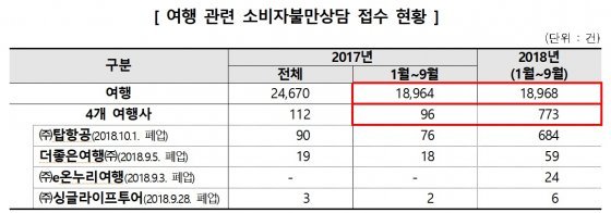 10일 한국소비자원에 따르면 최근 폐업한 탑항공, 더좋은여행, e온누리여행사, 싱글라이프투어 등 4개 여행사 관련 소비자 불만상담은 올해 1월1일부터 지난 9월30일까지 총 773건 접수됐다. 지난해 같은 기간보다 705.2% 증가했다. 같은 기간 전체 여행 관련 소비자불만상담 1만8968건의 4.1%를 차지했다.