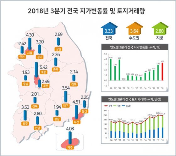 3분기 전국 땅값 3.33% ↑…광역시도 중엔 세종시 최고