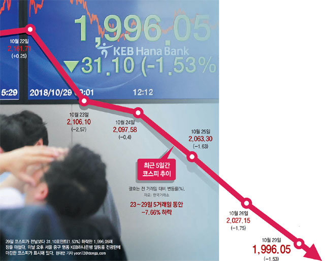 29일 코스피 2,000 선이 붕괴된 것은 대내외 악재로 증시의 기초체력이 약해진 상태에서 3분기(7∼9월) 실적을 발표한 국내 상장기업들의 ‘어닝 쇼크’가 더해졌기 때문이다. 이날 K뷰티를 이끄는 아모레퍼시픽은 3분기 영업이익이 지난해 같은 기간보다 24.3% 급감했다고 발표하면서 주가가 12.8% 곤두박질쳤다. 앞서 현대자동차도 지난해보다 76.0% 급감한 영업이익을 발표했다.