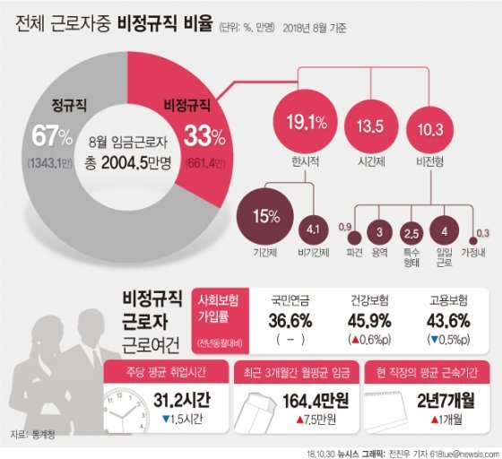 통계청이 30일 발표한 ‘경제활동인구조사 근로 형태별 부가조사 결과’에 따르면 올해 8월 기준 전체 임금근로자 2044만5000명의 33.0%인 661만4000명이 비정규직 근로자였다.