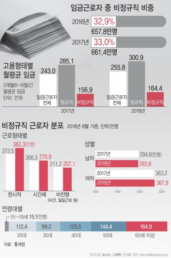 통계청이 30일 발표한 ‘경제활동인구조사 근로형태별 부가조사 결과’에 따르면 올해 8월 기준 비정규직 근로자 수는 661만4000명으로 1년 전보다 3만6000명(0.6%) 늘었다.