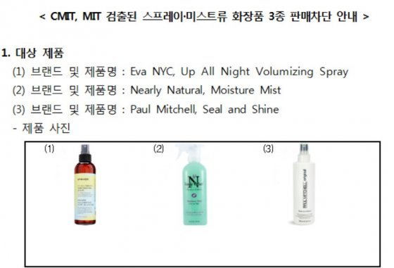 CMIT, MIT 검출된 스프레이 및 미스트류 화장품 3종 판매차단 안내. © News1(제공=한국소비자원)