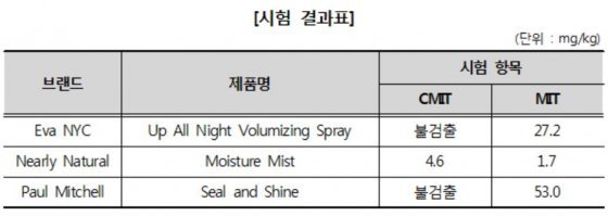 시험결과표 © News1(제공=한국소비자원)해외직구로 유통되는 스프레이·미스트 등 화장품에서 가습기 살균제 성분인 메칠클로로이소치아졸리논(CMIT)과 메칠이소치아졸리논(MIT)이 검출됐다. 이에 따라 한국소비자원(이하 소비자원)은 해당 제품의 온라인 판매를 긴급 차단하고 소비자들에게 각별한 주의를 당부했다.