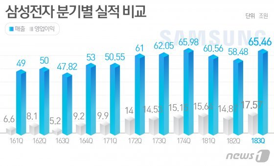 © News1삼성전자가 31일 발표한 지난 3분기 영업이익은 17조5700억원이다. 지난 1분기 분기 기준 역대 최대치(15조6000억원)를 2분기 만에 경신한 최고 실적이다. 영업이익률도 26.8%(매출액 65조4600억원)로 사상 최고 기록 행진을 이어갔다.