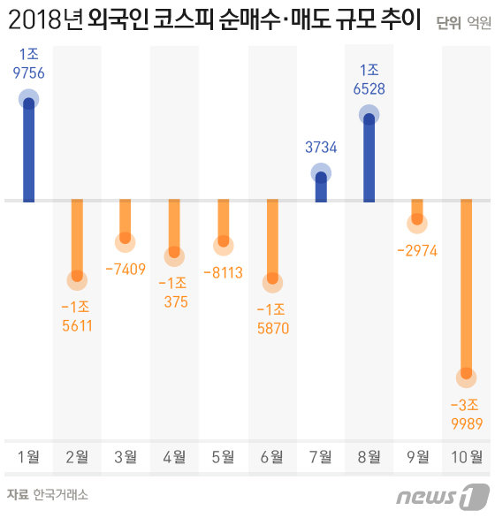 반면 이달 개인과 기관 투자자는 각각 1조9117억원, 1조7887억원씩 순매수했다. 외국인의 매물을 반씩 나눠 받은 셈이다. 이는 지난 2015년 8월(-4조1092억원) 이후 3년2개월만에 최대 규모의 ‘셀 코리아’(Sell Korea)다.