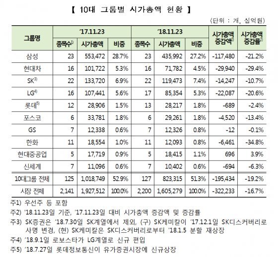 26일 한국거래소가 발표한 ‘10대 그룹의 시가총액 및 주가등락 분석’ 자료를 보면 올해 11월23일까지 주식시장에서 10대 그룹의 시가총액은 지난해 같은 기간(1018조원)과 비교해 19.2%(195조원) 감소한 823조원으로 나타났다.