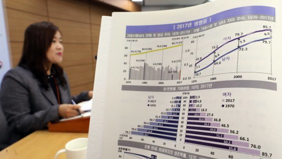 김진 통계청 인구동향과장이 3일 정부세종청사 기획재정부 브리핑실에서 2017년 생명표 브리핑을 하고 있다. 통계청은 작년 기대수명은 여성의 경우 85.7세, 남성의 경우 79.7세이며 이는 OECD 가입국 평균보다 약 2년정도 높은 수치라고 밝혔다. 또한 주요 사망원인으로는 암이 1위이며 심장질환과 폐럼으로 인한 사망률이 크게 늘었다. 2018.12.3/뉴스1 © News1 장수영 기자통계청 ‘17년 생명표’…기대수명 男 79.7세, 女 85.7세