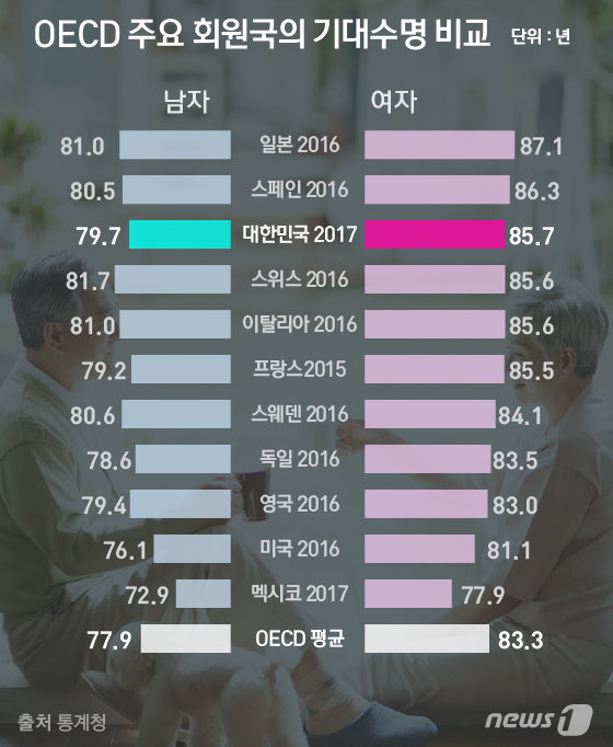 © News1 김일환 디자이너2017년 생명표…OECD 평균보다 男 1.7년 女 2.4년 길어