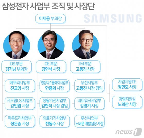 © News1이 부회장은 이번 인사에서 ‘성과 있는 곳에 보상이 있다’는 인사 원칙을 재확인하는 동시에 그룹 안팎의 불확실성을 감안해 조직 안정을 꾀한 것으로 보인다. 김 신임 부회장과 노태문 IM부문 무선사업부 개발실장(사장)의 승진 외에 김기남(DS)·김현석(CE)·고동진(IM) 등 ‘3인 대표이사 CEO(최고경영자)’ 체제를 유지하는 등 사장단 상당수가 유임됐다.