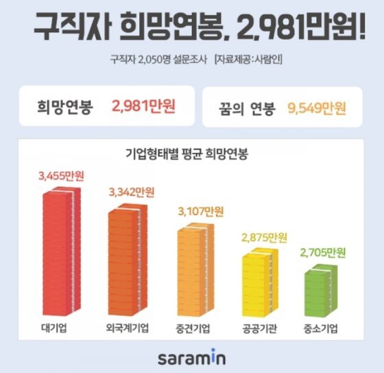 구직자 희망 연봉 2981만원… 대기업 3455만원 vs 중기 2705만원