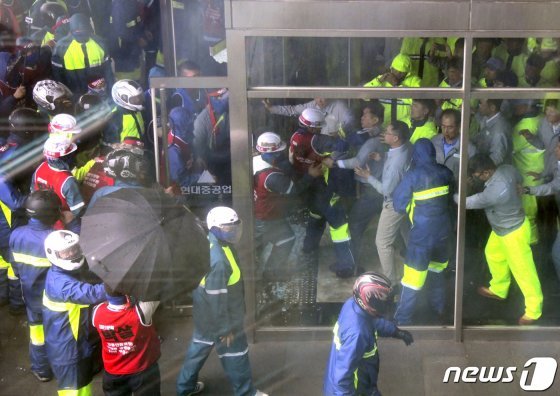 27일 오후 2시30분께 파업 중인 현대중공업 노조 조합원들이 경영진 면담을 요구하며 본관 진입을 시도하자 사측 경비요원들이 이를 막아서며 몸싸움을 벌이고 있다.(현대중공업 제공) 2019.5.27/뉴스1 © News1 현대중공업은 법인분할(물적분할)을 위한 주주총회에 반대해 파업하거나 주주총회장을 점거하는 과정에서 폭력을 행사한 조합원 등의 징계 절차에 착수했다.
