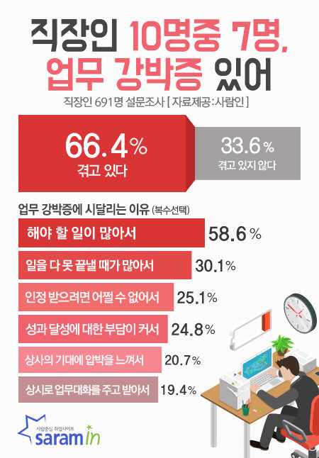 취업포털 사람인이 직장인 691명을 대상으로 ‘업무 강박증’을 주제로 조사한 결과, 66.4%가 근무시간 외에도 업무 고민 및 압박감에 시달리는 강박증을 겪고 있다고 털어놨다.