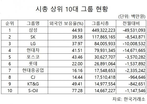 그룹별로 보면 국내 대표 그룹인 삼성의 시총은 449조3222억원으로 같은 시간 49조5311억원 줄었다. 10대 그룹 전체 시총 감소액의 53.2%를 삼성이 차지하며 가장 큰 규모로 축소됐다.