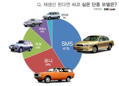 ‘재생산 된다면 사고 싶은 단종모델’ 1위에 르노삼성 1세대 ‘SM5’가 올랐다. 2위는 현대 ‘포니’, 3위 쌍용 ‘무쏘’, 4위 대우 ‘프린스’, 5위 현대 ‘싼타모’ 순이었다.