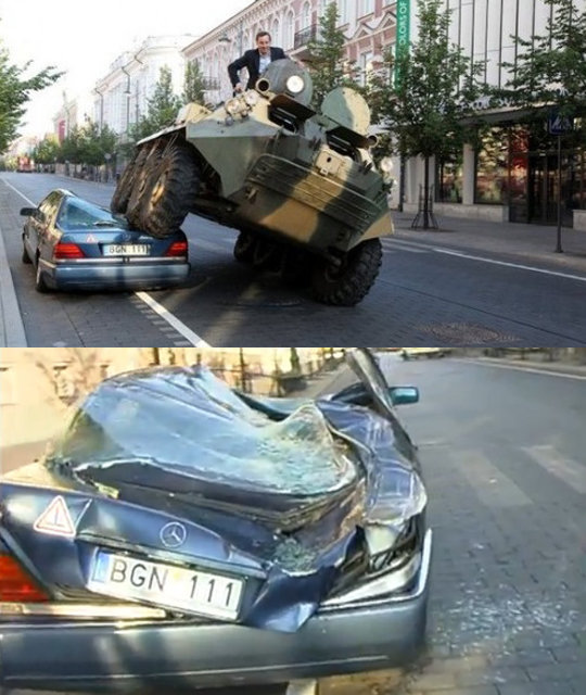 지난 1일 미국 자동차 전문 사이트 카스쿠프는 리투아니아 수도 빌뉴스의 아트라스 주오카스 시장이 불법주차를 하는 이들에게 경각심을 주기위해 장갑차로 벤츠를 짓밟았다고 보도했다.