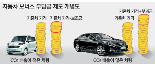 이르면 내년 7월부터 국산, 외제 가릴 것 없이 경차와 전기차 등 이산화탄소(Co₂) 배출량이 적은 차에 정부 보조금이 지급돼 차량 가격이 싸진다. 그 대신 Co₂ 배출량이 많은 중·대형차는 부과금이 부과돼 비싸지는 ‘보너스 부담금(Bonus-Malus)’ 제도가 도입된다.