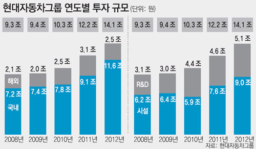 현대차그룹은 이와 같은 내용의 내년 투자 및 고용 계획을 확정했다고 29일 밝혔다. 2012년 연간 투자액 14조1000억 원은 올해 투자금액 12조2000억 원보다 15.6% 증가한 액수다. 현대차그룹 관계자는 “내년 상황이 좋지 않은데도 투자 확대를 결정한 것은 어려울 때도 투자를 계속해야 한다는 판단 때문”이라며 “투자 확대는 앞으로 경기가 상승 곡선을 탈 때 효과를 볼 수 있을 것”이라고 말했다.