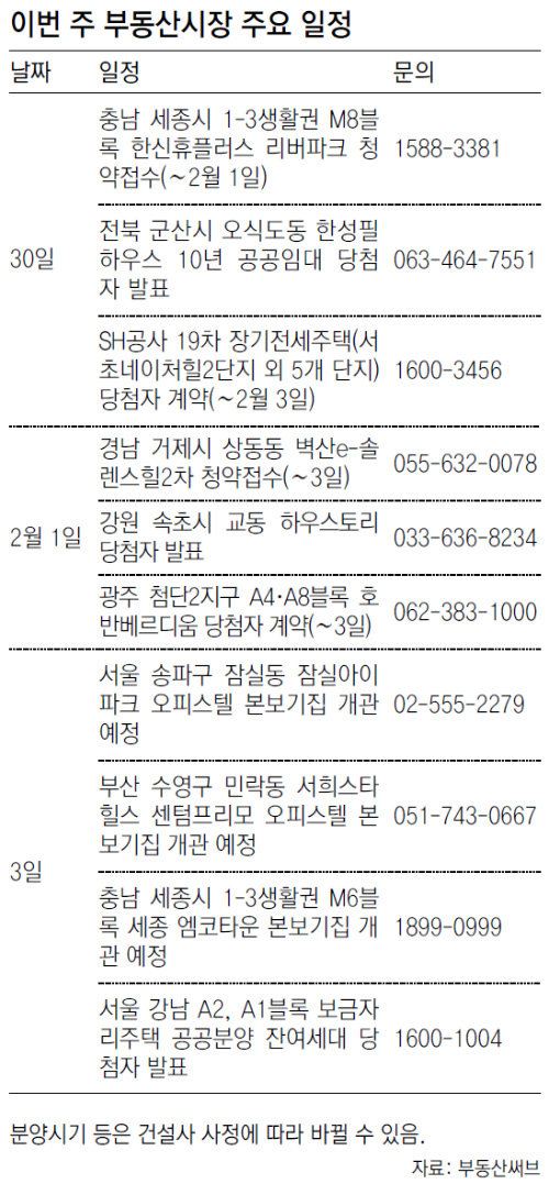 설 연휴 이후 한산했던 분양시장에 다시 활기가 돌고 있다. 29일 부동산정보업체 부동산써브에 따르면 1월 마지막 주 분양시장에선 청약접수 3곳, 당첨자 발표 3곳, 당첨자 계약 8곳, 본보기집 개관 3곳 등이 예정돼 있다. 30일 한신공영은 충남 세종시 1-3생활권 M8블록에 공급하는 ‘세종 한신휴플러스 리버파크’의 청약접수를 진행한다. 지하 1층∼지상 29층 11개 동으로 구성되며, 전용면적 67∼120m² 955채 중 319채가 일반분양된다. 정부청사로 걸어서 출퇴근할 수 있으며 블록 내에 유치원과 초중고교가 있다. 2월 3일 현대산업개발은 서울 송파구 잠실동에 공급하는 오피스텔 ‘잠실아이파크’의 본보기집을 개관한다. 지하 1층∼지상 10층 2개 동에 전용면적 24m²로 구성된 223실이 들어선다. 지하철 2호선 신천역을 걸어서 이용할 수 있고 롯데백화점, 현대백화점, 석촌호수 등의 편의시설이 가깝다. 같은 날 서희건설은 부산 수영구 민락동에 지을 오피스텔 ‘서희스타힐스 센텀프리모’의 본보기집을 연다. 지하 5층∼지상 20층 1개 동으로 구성되며 전용면적 19∼47m² 630실로 이뤄졌다. 광안리 해수욕장과 걸어서 5분 거리에 있으며 단지 인근에 백화점, 요트경기장, 올림픽공원 등이 있다.